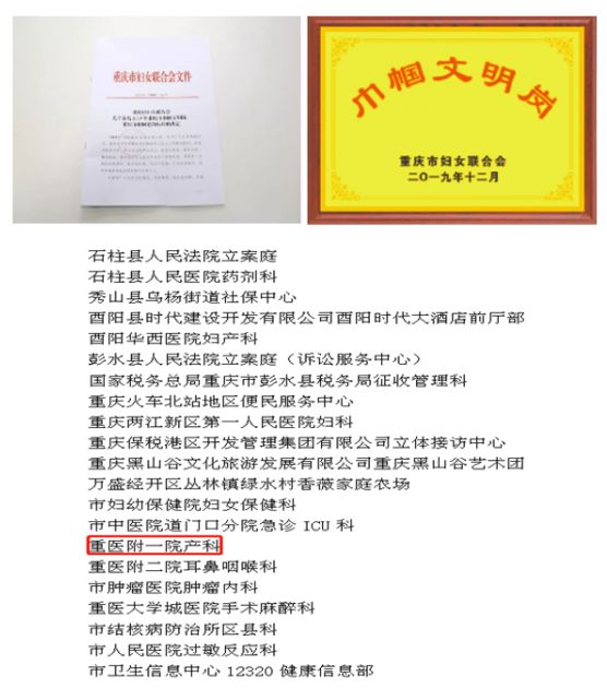 近来,重医一院产科喜获2019年度“重庆市女性文明岗”及重庆市教科文卫体体系“先进职工之家”两项荣誉称号。