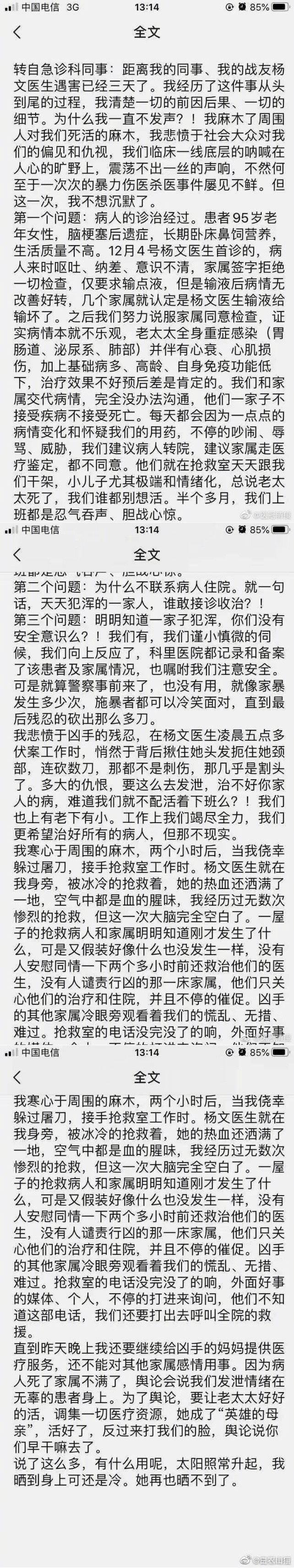 逝者杨文医生对待患者情绪和蔼,十分耐性,咱们获悉音讯后,心境十分悲痛,更是特别愤恨。杨文医生是一位优异的医生,是工作中的主干,是家庭的支撑。这种损害医生的,严峻的刑事违法行为,必将遭到法令严惩,这是国家卫健委一向的情绪。