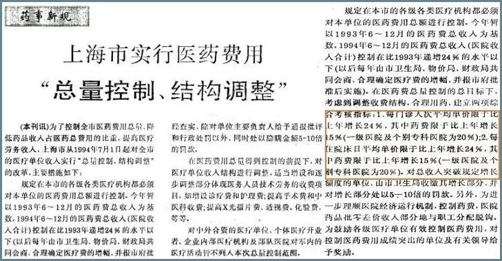 然后是1994年7月1日,上海市为了操控全市医药费用总量,下降药品收入占医药总费用的比重,进步医疗劳务收入,对全市的医疗单位收入施行 “总量操控,结构调整”的变革。