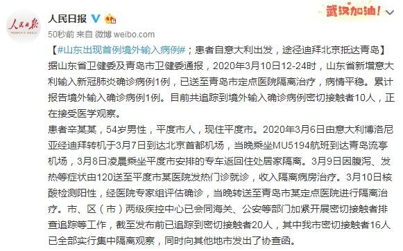 据山东省卫健委及青岛市卫健委通报,2020 年 3 月 10 日 12-24 时,山东省新增意大利输入新冠肺炎确诊病例 1 例,已送至青岛市定点医院阻隔医治,病况平稳。累计陈述境外输入确诊病例 1 例。现在共追寻到境外输入确诊病例密切接触者 10 人,正在承受医学调查。