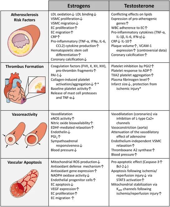 图1. 雌激素和睾酮对斑块发展、动脉血栓构成、凝血、血管损害和愈合的影响。